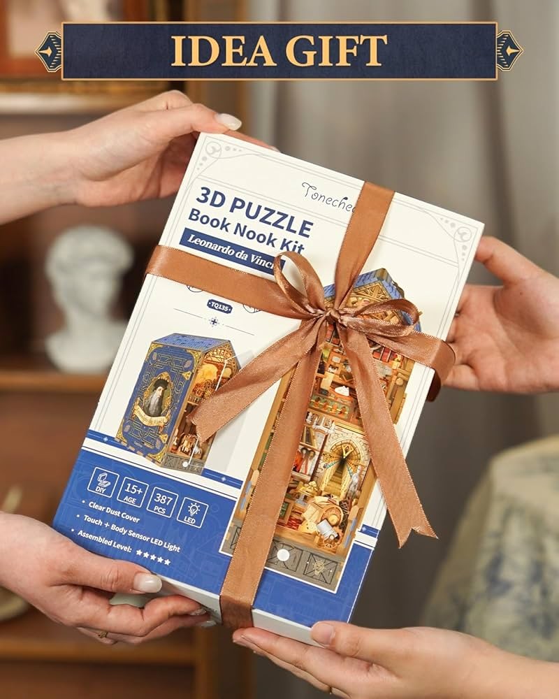 Met de DIY Book Nook, Leonardo da Vinci bouw je zelf een miniatuurwereld vol verbeelding en mysterie. Deze 3D modelbouwset brengt kunst, wetenschap en geschiedenis samen in een prachtig verlichte scène, een eerbetoon aan het creatieve brein dat de wereld veranderde.