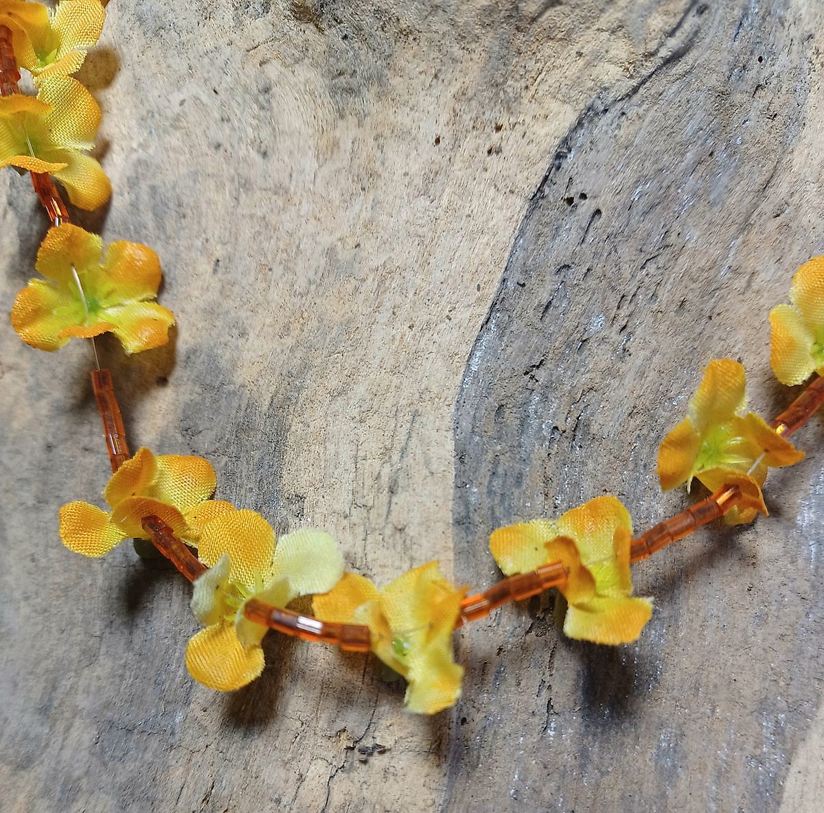 Lieflijke ketting gemaakt van oranje/gele kralen en stoffen bloemetjes.