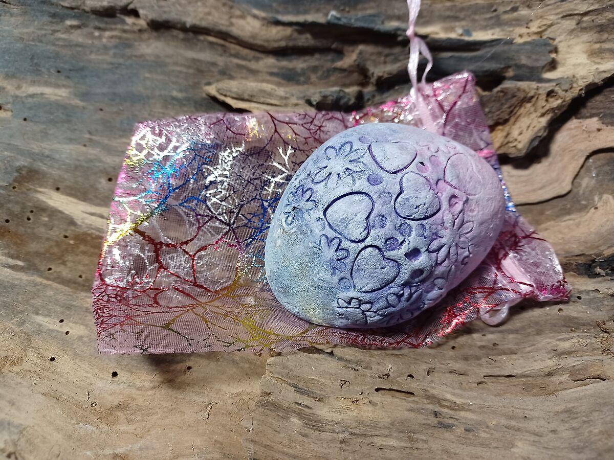 Mooie handgemaakte 3D happy stone in zachte pasteltinten met hartjes en sterren in reliëf.