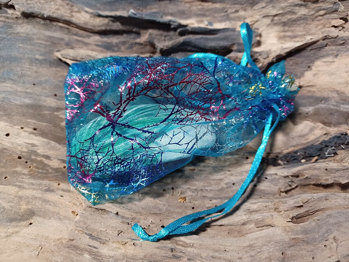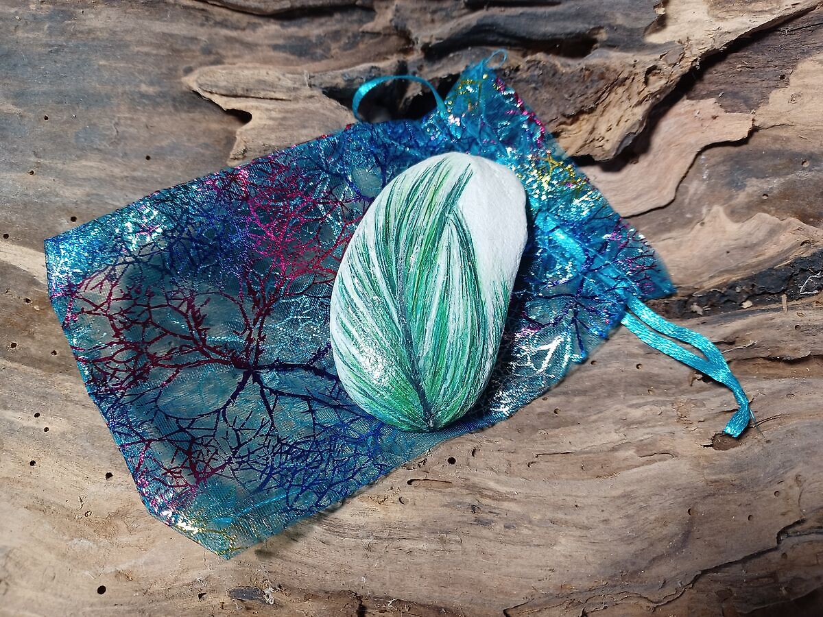 Handbeschilderde steen met de afbeelding van een groene veer.