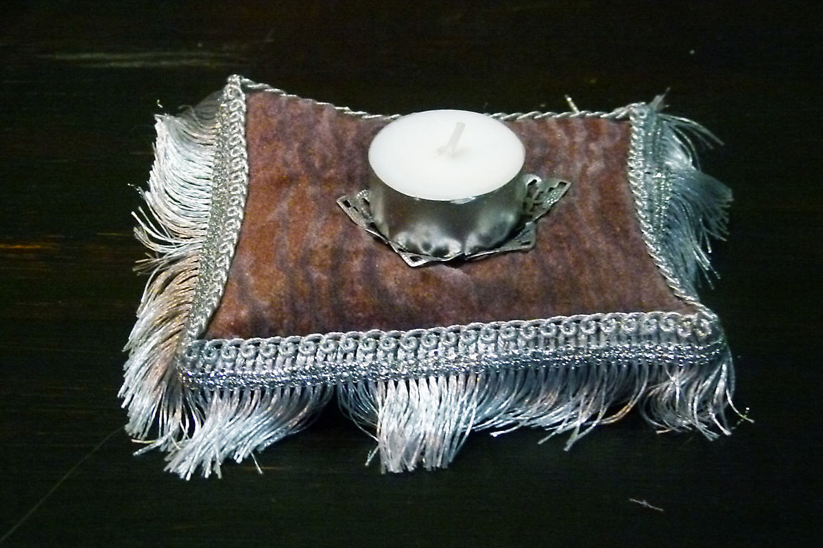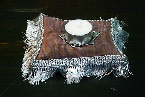 Beautiful and atmospheric tea light holder in the shape of a pillow with silver fringe.